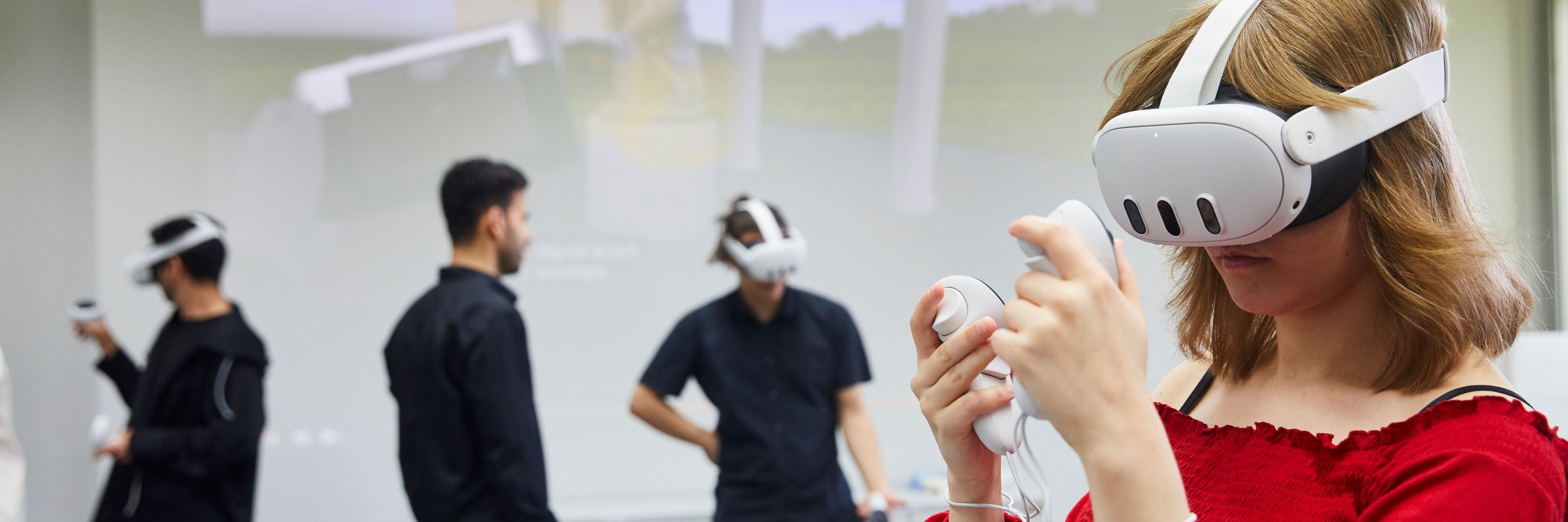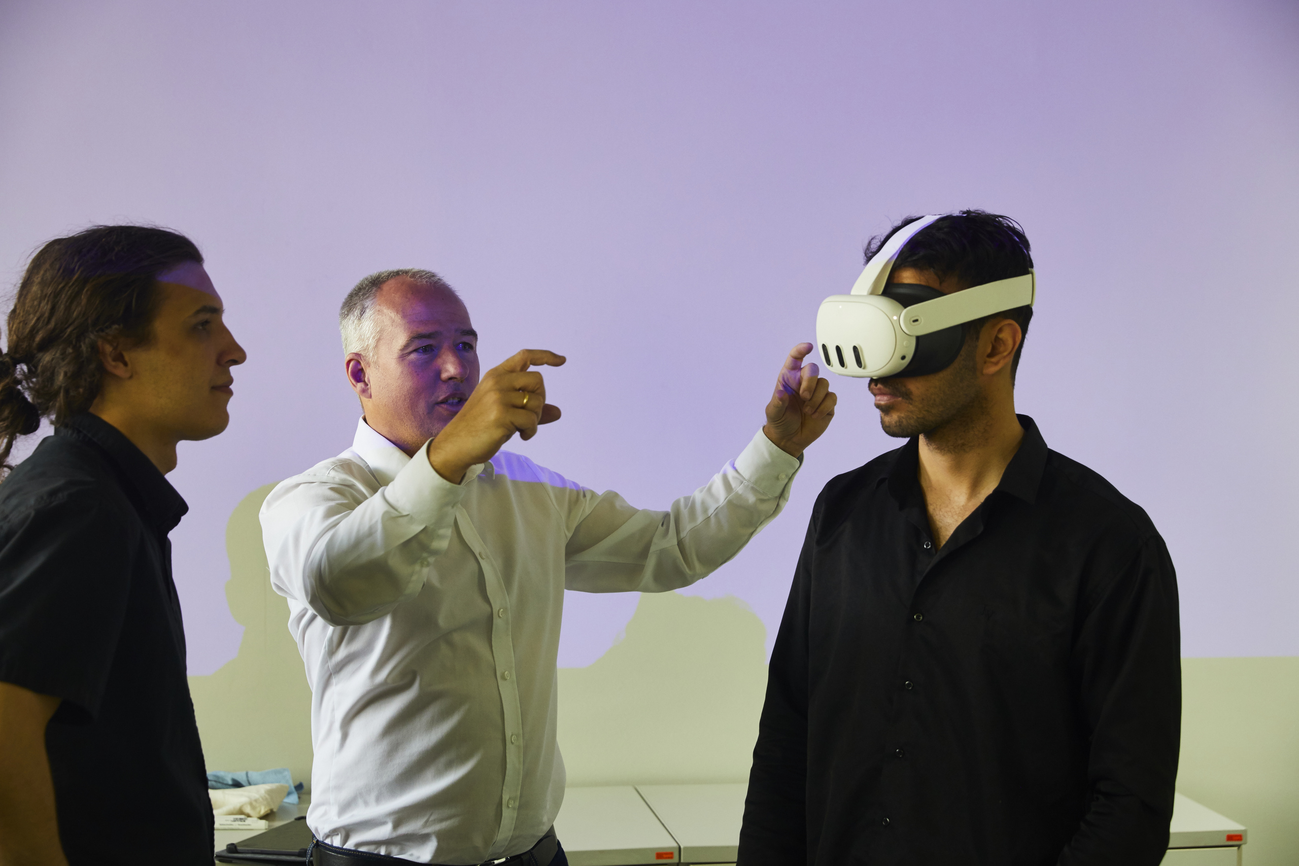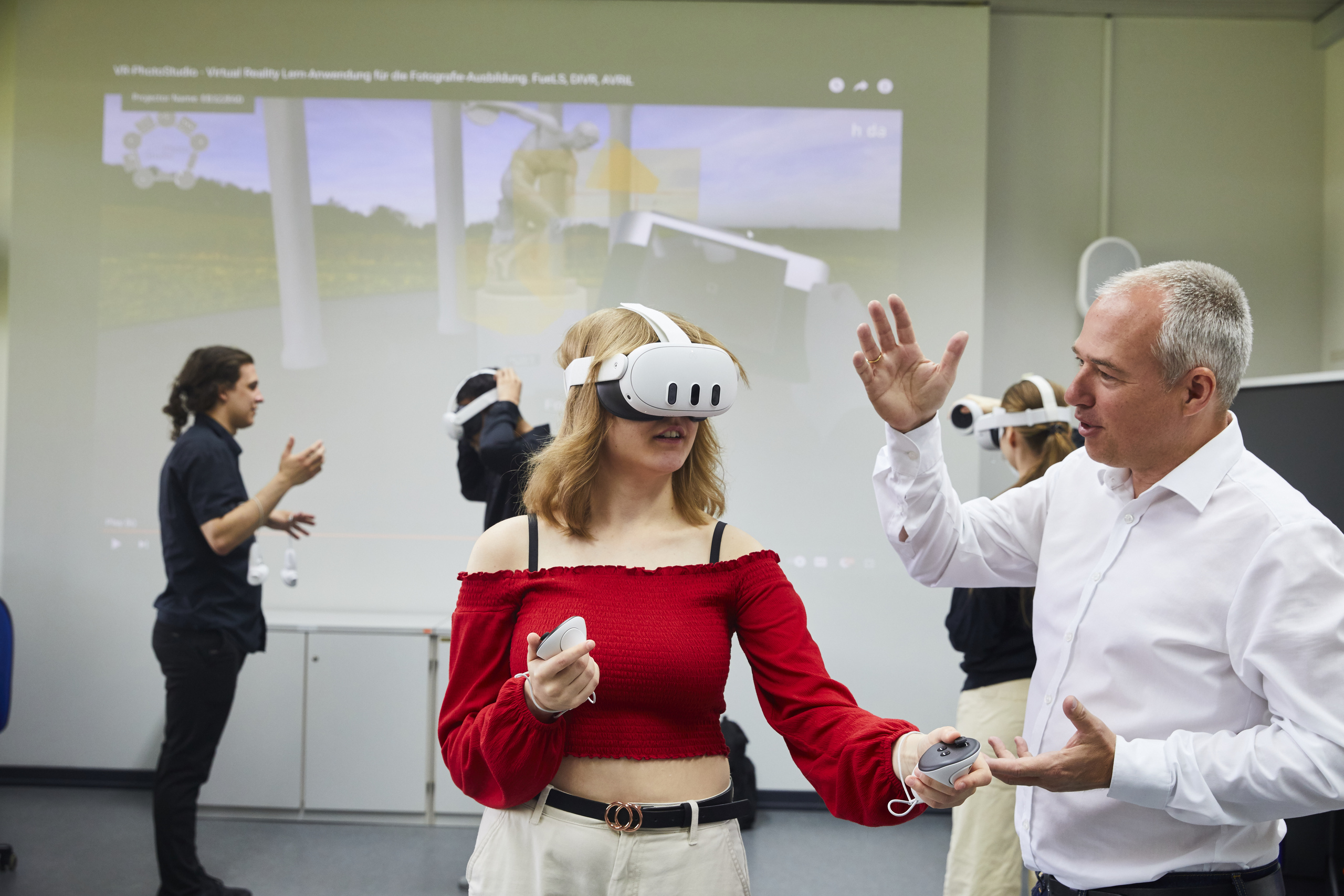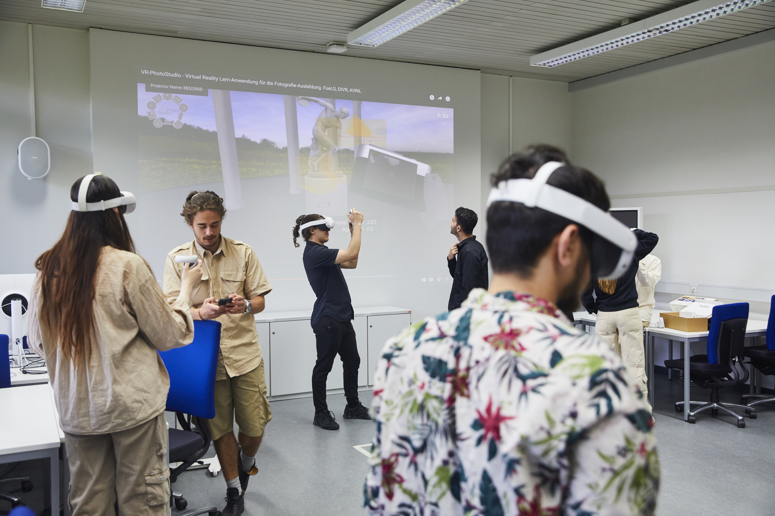 Die Studierenden im zweiten Semester „Augmented and Virtual Reality Design“ nimmt Professor Grimm an diesem Tag mit in die Welt des Fotostudios. Sie sollen die neue Anwendung als autarken Übungsort nutzen. Die Studierenden haben ihre eigenen VR-Brillen dabei oder nutzen Geräte der Hochschule. In Zweiergruppen lässt der Professor sie den neuen Lernort betreten, wobei immer nur einer den virtuellen Raum erkunden darf, während der andere achtgibt, dass die Gruppen im wirklichen Seminarraum nicht zusammenstoßen oder gegen Tische oder Wände laufen.