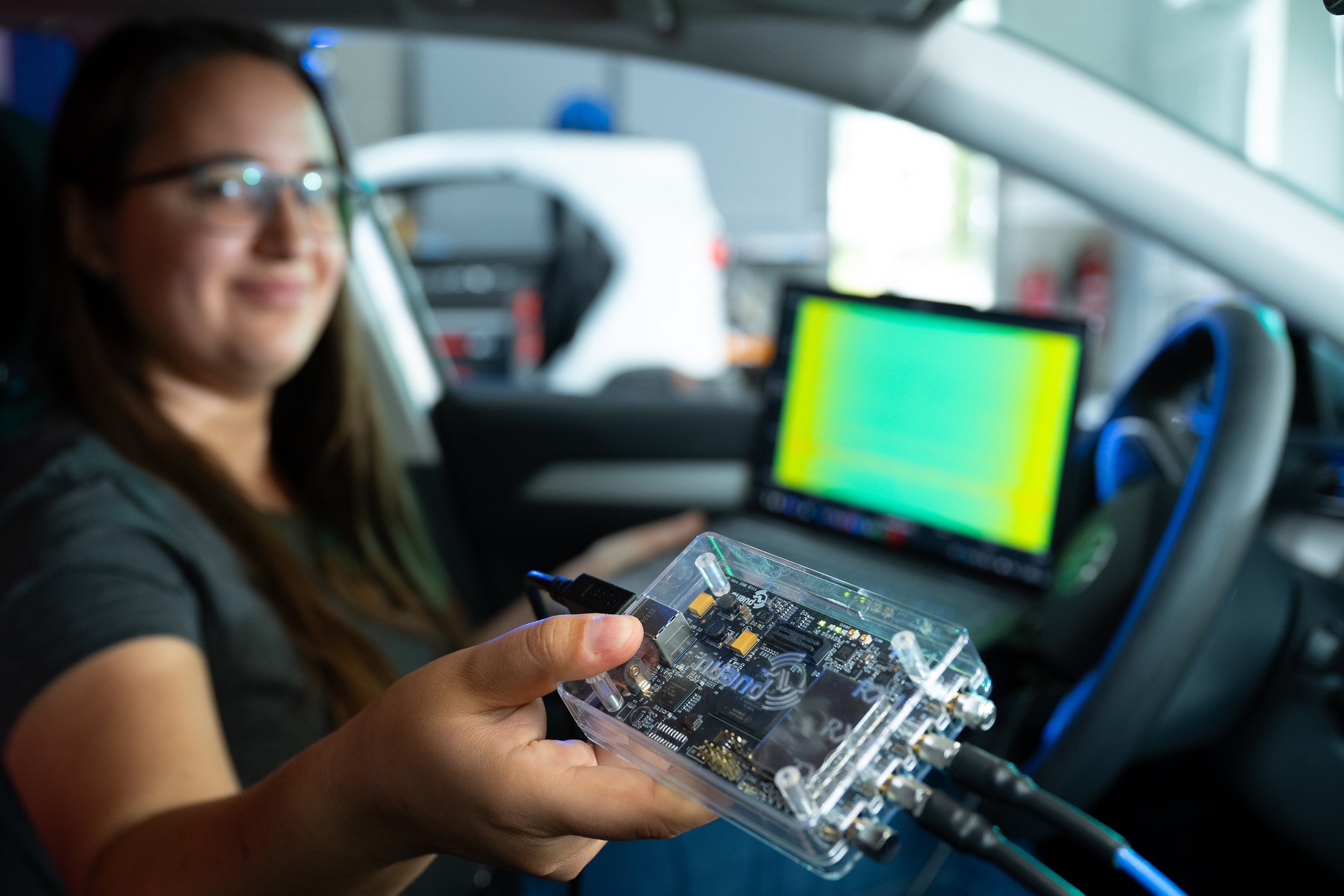 „Der physische Zugang zum Fahrzeug ist oft der erste Schritt zu weiteren Attacken“, sagt Hannah Nöttgen und beschreibt damit ihren Schwerpunkt im Projekt. „I’m the wireless guy“, stellt sich Matteo Varotto mit einem Augenzwinkern vor. Er fokussiert sich auf Funksignale. Beide beobachten ein mangelndes Bewusstsein für Datenschutz in Kombination mit Autos. „Datensicherheit beim Smartphone haben viele inzwischen im Blick. Aber die wenigsten machen sich Gedanken darüber, was ihre Autos alles über sie verraten“, sagt Matteo. „Moderne Autos sind Datenkraken“, warnt Hannah.
