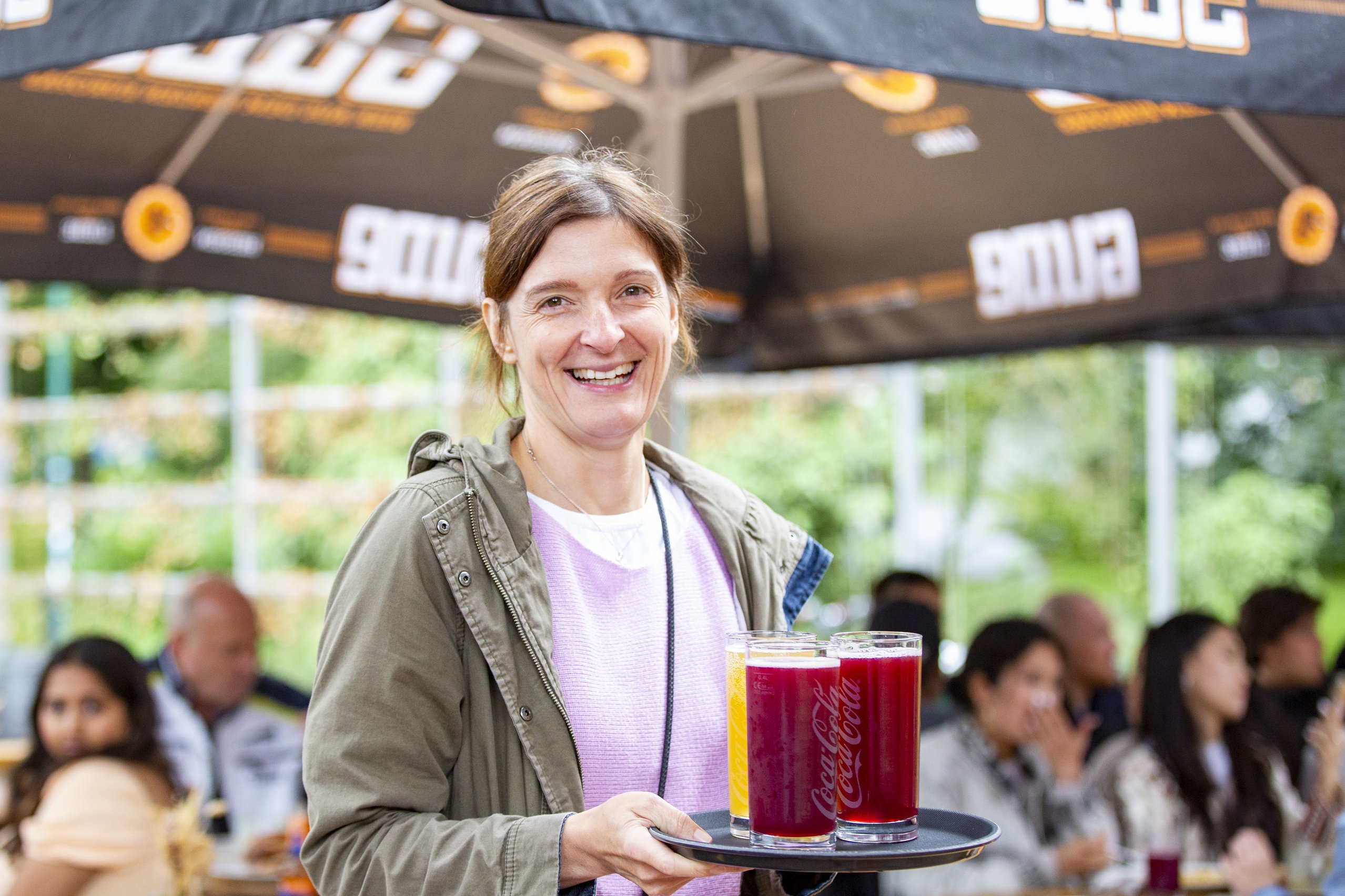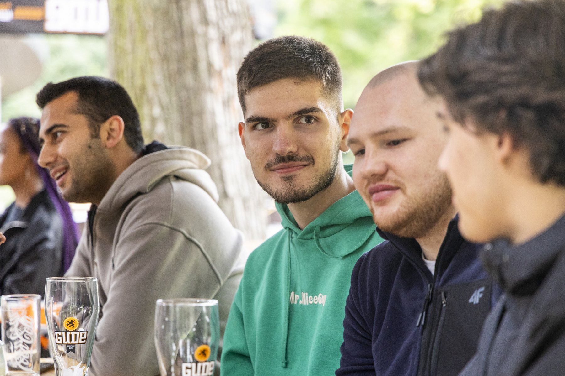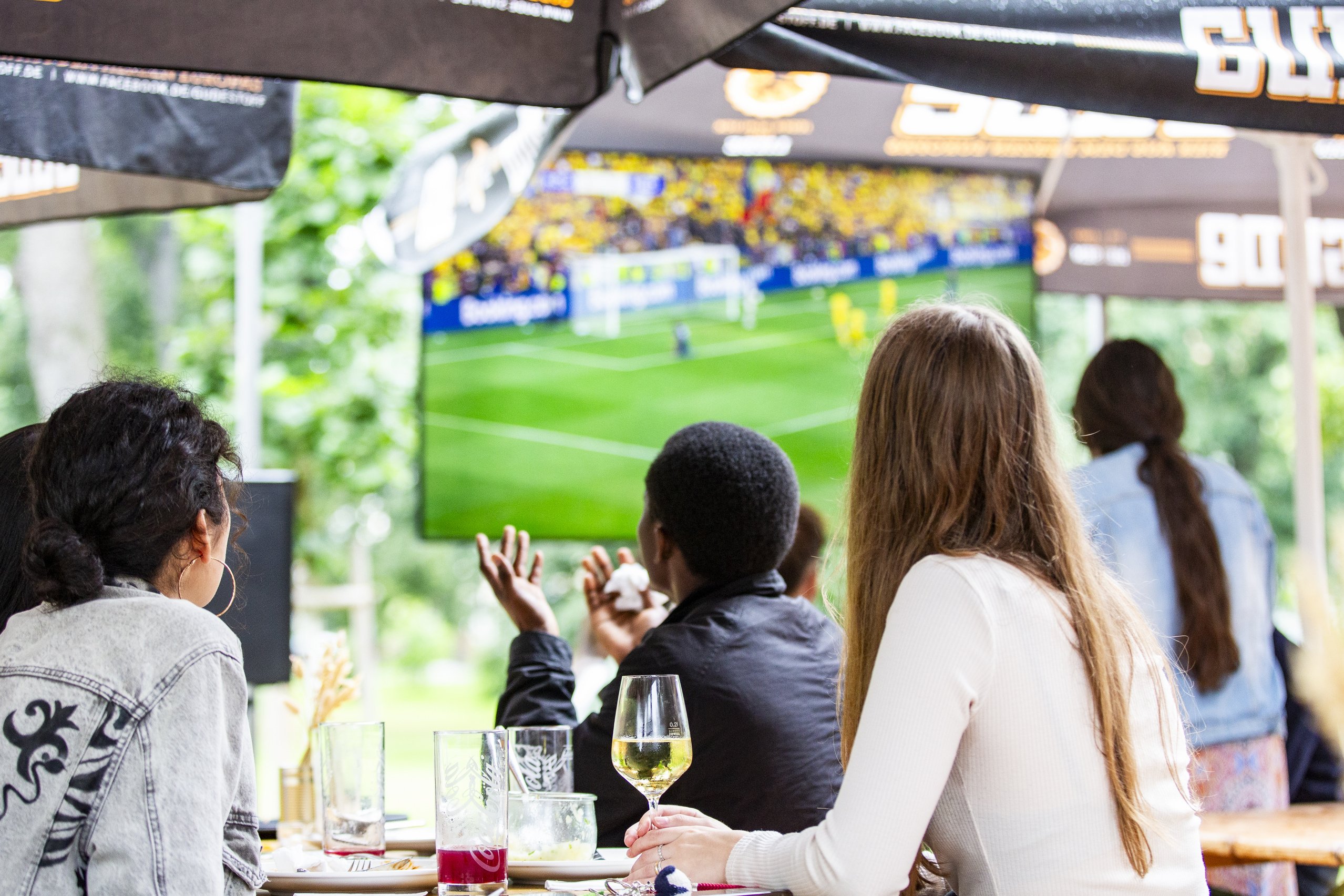 Der Sommer zeigt sein verregnetes Gesicht. Erbarmungslos nieselt es von einem grauen Wolkenhimmel, noch dazu bei 16 Grad Kühle. Ob Bäume, Büsche, Biergarnituren oder Sonnenschirme – alles betröpfelt und nass. Auch stimmungsmäßig brennt auf den ersten Blick nicht gerade die Hütte im Herrngartencafé in Darmstadts zentralem Stadtpark. Bei schönem Wetter wären jetzt sämtliche Tische besetzt zum Public Viewing für die Fußball-Europameisterschaft. Heute ist so gut wie niemand da. Doch ganz am Rande sitzt eine schulklassengroße Gruppe junger Menschen zusammen zwischen flimmernden TV-Großbildschirmen und macht einen fidelen Eindruck.