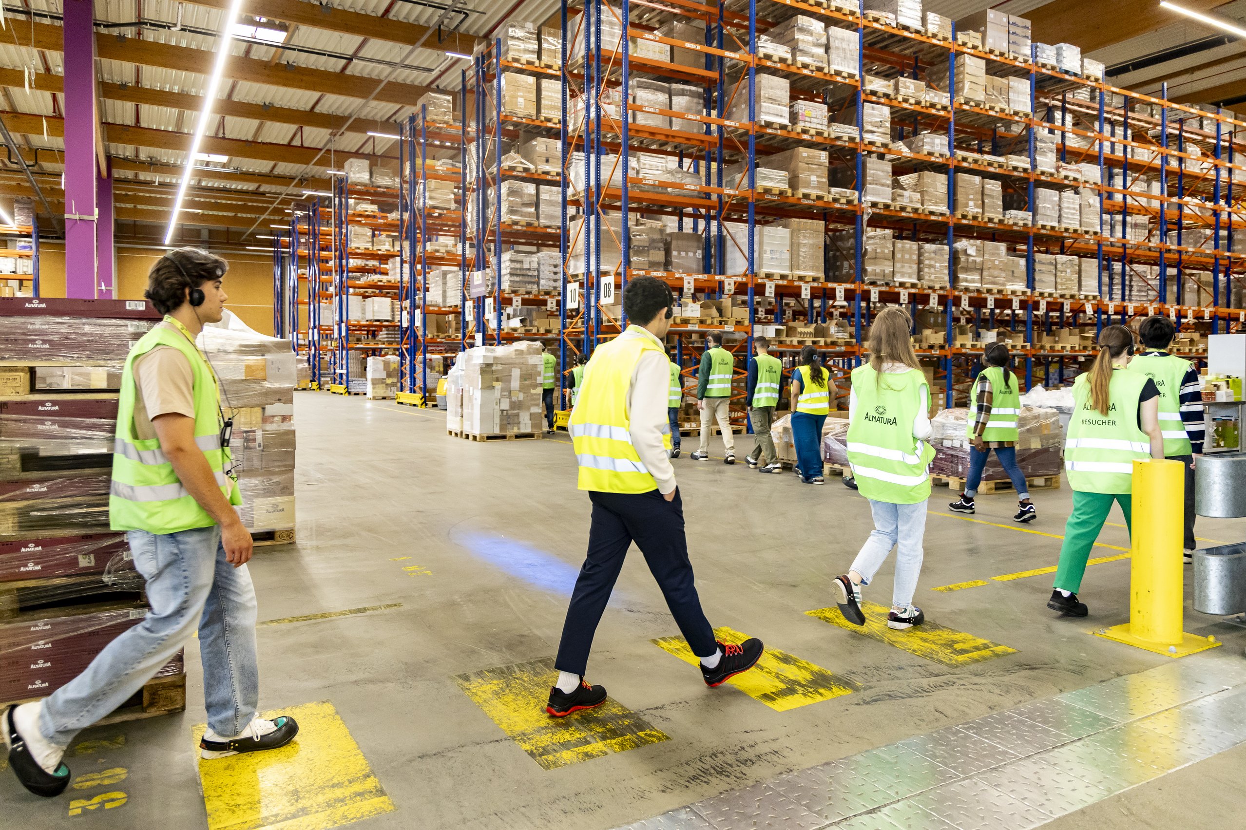 Diese Erkenntnis winkt auch am nächsten Tag bei einer Führung im Verteilzentrum des Bio-Lebensmittelhändlers Alnatura in Lorsch. Ausstaffiert mit grünen Sicherheitswesten und aufgeschnallten Schutzkappen über den Schuhen laufen die EUT+-Studis entlang gelber Bodenlinien wohlgeordnet wie eine kleine Ameisenstraße durch die riesige Lagerhalle. Ein Hauch von Abbey Road liegt in der Luft, während die Besucherschlange im Gänsemarsch etliche Zebrastreifen quert. Und spätestens bei den Haltepunkten heißt es dann: staunen. Besonders im Hochregallager. 20 Meter hoch reichen die Regalwände mit insgesamt 32.000 Stellplätzen für Lebensmittelpaletten, vollautomatisiert werden sie von Regalbediengeräten oder Roboterarmen gehoben und über Rollenförderbänder zum Warenausgang gefahren.