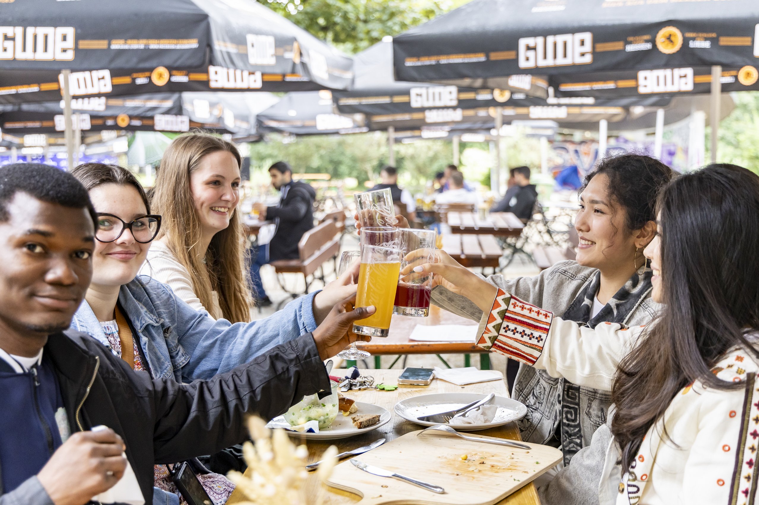 Im verregneten Biergarten indes ist Logistik-Professorin Futschik mehr mit der Lieferkette für Essen und Getränke beschäftigt. Auf einen Zettel haben die Studierenden Essensbestellungen geschrieben, die schwungweise an der Ausgabe auflaufen. Da packt die Professorin – „euer Essen ist fertig“ – auch mal selbst an, um Teller an Tische zu tragen. Hungrig macht sich der europäische Logistiknachwuchs dann über Schnitzel mit Pommes, Handkäs mit Musik oder Gulasch mit Spätzle her. Das derweil laufende EM-Spiel Holland gegen Rumänien findet hingegen wenig Beachtung.