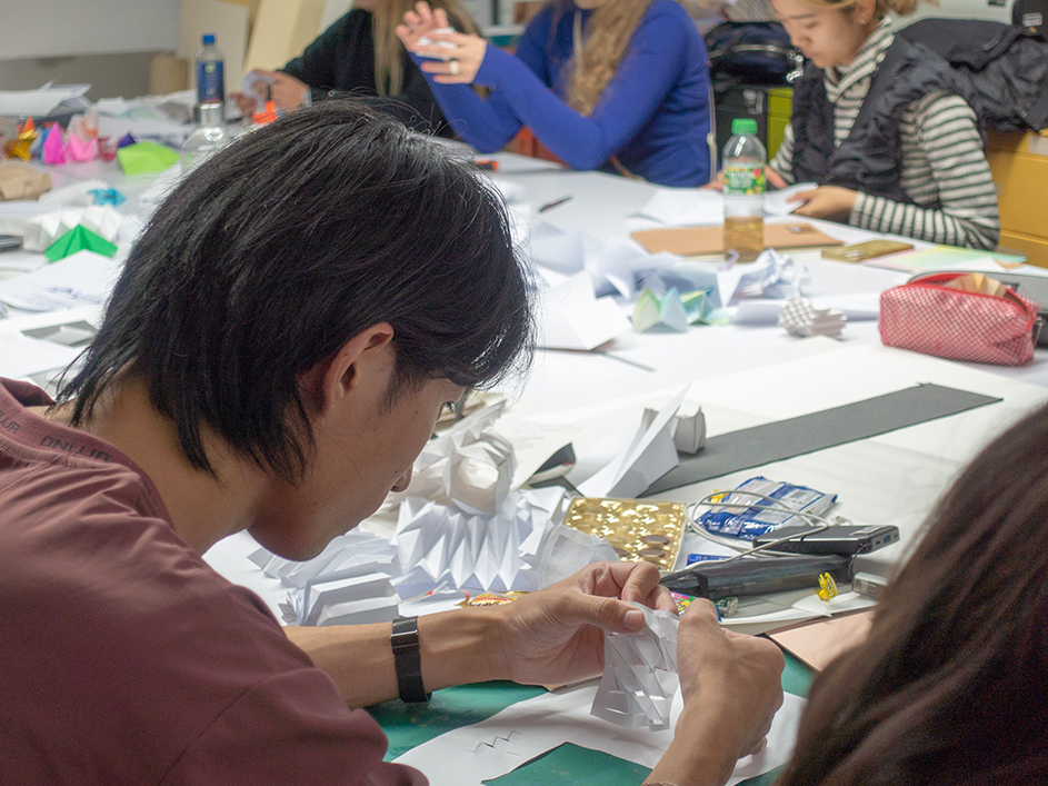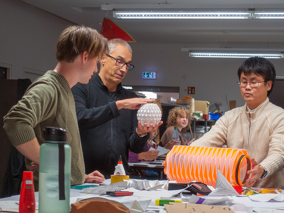 Geleitet wurde der Workshop von Prof. Dr. Wataru Saito und Genki Fujita. Wataru Saito erforscht und lehrt die mathematischen und geometrischen Grundlagen des Origami und deren Anwendung auf reale Strukturen und Produkte. Genki Fujita ist Industriedesigner und leitet die Digitalwerkstatt am Department of Design der Kyushu University.