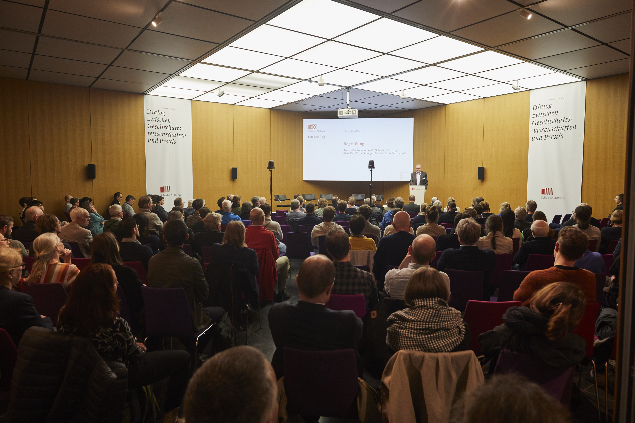 „Eine ökologieverträgliche Wirtschaft kann niemals wachsen, während eine wachsende Ökonomie niemals ökologieverträglich sein kann.“ Mit diesem Zitat eröffnete Alexander Gemeinhardt, geschäftsführender Vorstand und Direktor der Schader-Stiftung, den Abend. Als Gastgeber begrüßte er zum fünften h_da Dialog-Forum mehr als 200 Besucher:innen im Schader-Forum. Nicht wenige von ihnen waren überrascht, als Gemeinhardt zum Ende seiner kurzen Begrüßung Prof. Dr. Niko Paech als Urheber des Zitats benannte. Jener Paech, prägende Persönlichkeit der Postwachstumsökonomie hierzulande, der als Referent schon in den Startlöchern saß.