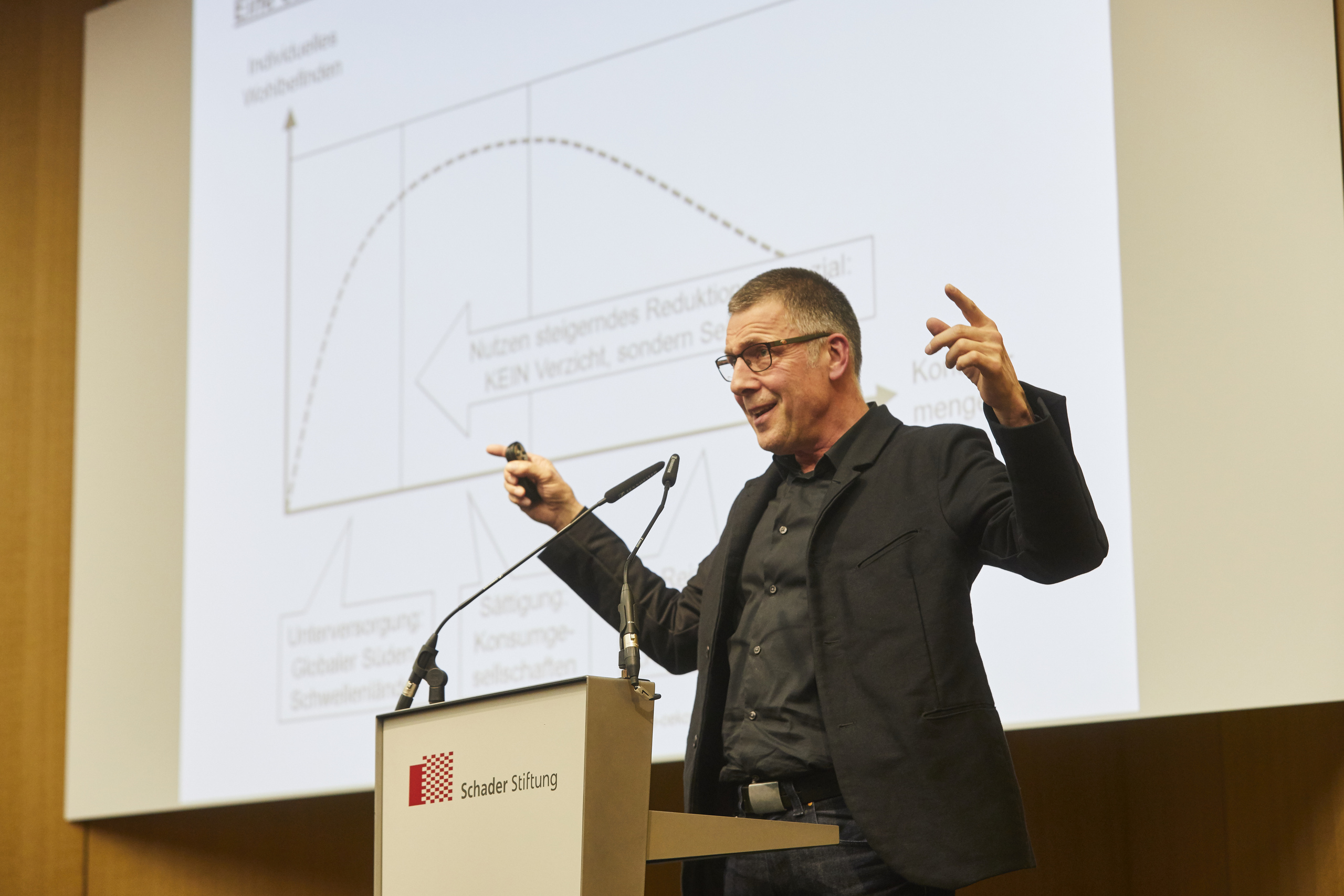 Frühzeitig bekräftigte Paech, dass auch er nicht (mehr) an grünes Wachstum, also die Entkopplung der Wirtschaftsleistung von der damit einhergehenden Umweltbelastung, glaubt. „Alleine die Rebound-Effekte sind erdrückend“, sagte er und nannte exemplarisch Nebenwirkungen der deutschen Energiewende. Vielmehr glaubt Paech: „Wir stehen vor einer zweiten Welle der massiven Zerstörung.“ Quasi im Vorbeigehen lieferte er Thesen wie: „Unser Wohlstand ist nicht Resultat menschlicher Leistung, sondern in Gang gebrachter Prozesse der Maschinisierung. Die Postwachstumsökonomie ist die Rückgabe einer Beute.“ Die Rückkehr zu einer „kleineren Wirtschaft“ sei zwingend notwendig. Das, betonte Paech, sei weder innovationsfeindlich noch impliziere es, dass alle Unternehmen schrumpfen. Wohl aber müssten Unternehmen suffiziente Strategien gestalten, um unter diesen neuen Rahmenbedingungen zu besteh
