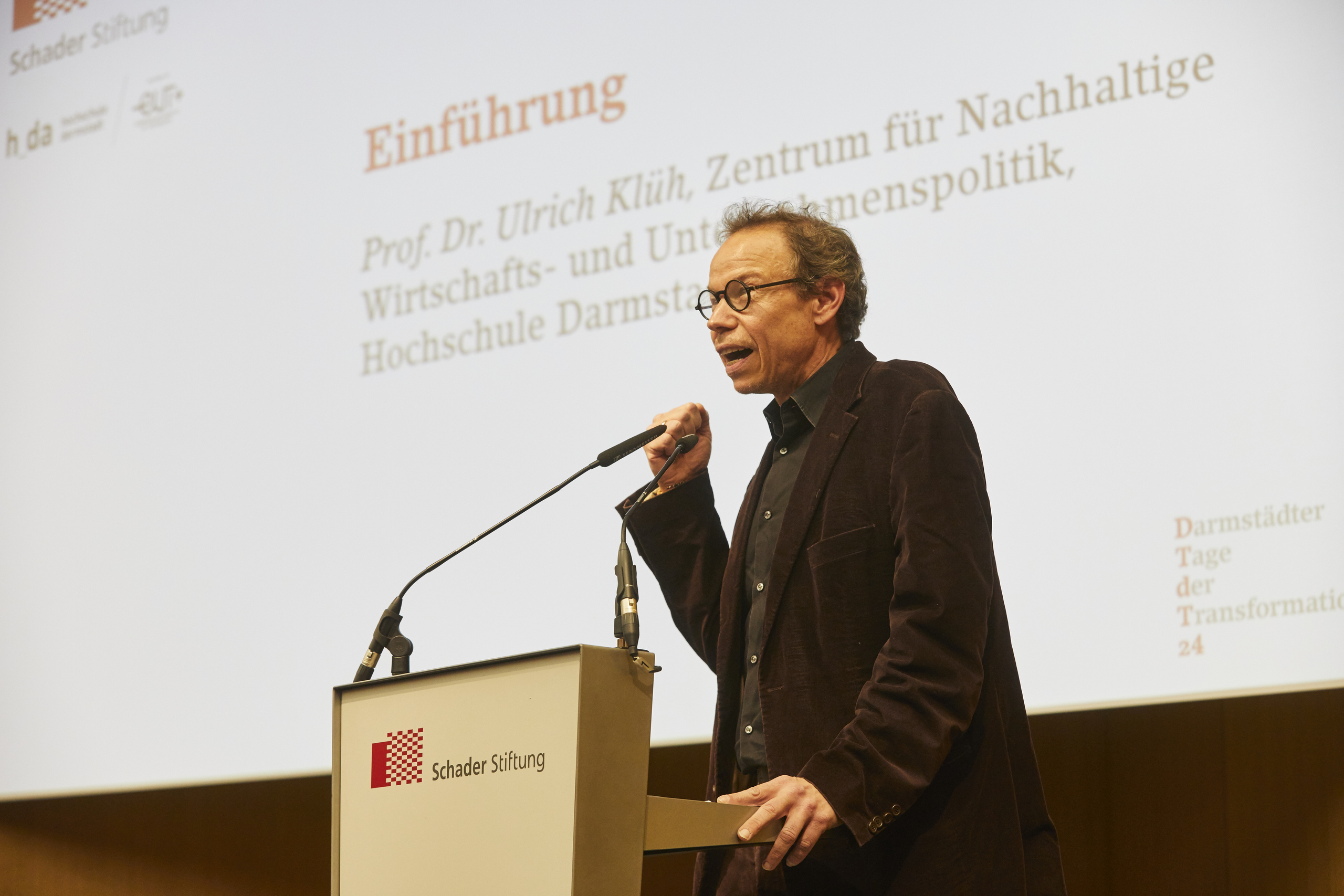 Prof. Dr. Thomas Döring, Professor für Politik und Institutionen und Leiter des Servicezentrums Forschung und Transfer, begrüßte für die h_da. Als „spaßfreien Miesmacher“ habe die Bild-Zeitung Paech einst bezeichnet, führte Döring den Protagonisten launig ein – und vermutete zugleich, Paech dürfte das eher als Kompliment aufgefasst haben. Döring moderierte später gemeinsam mit Dr. Kirsten Mensch (Schader-Stiftung) die Podiumsdiskussion.