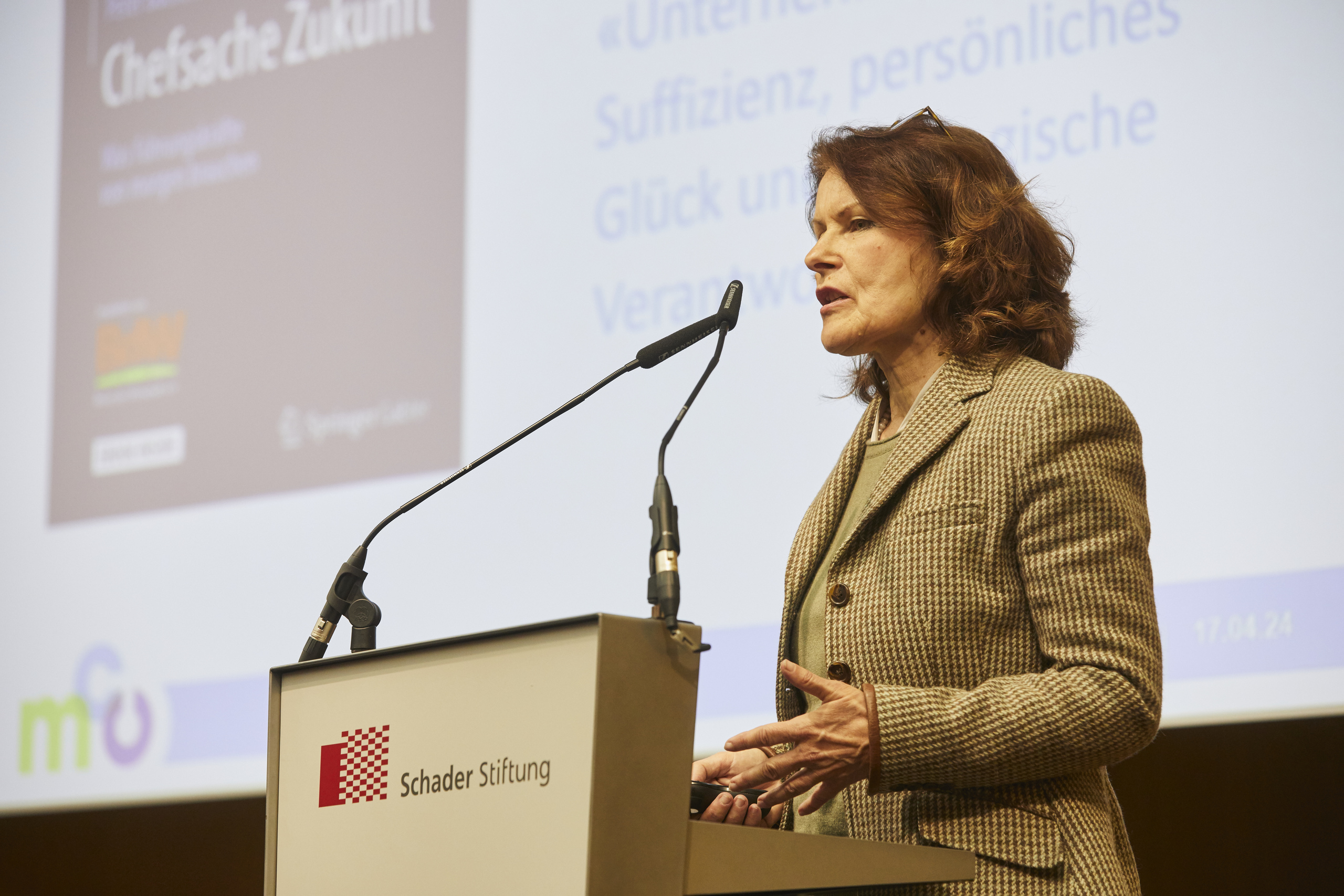 Doch Suffizienz alleine genüge nicht. Es brauche zudem eine dynamische Regionalökonomie, in der Unternehmen etwa mit gebrauchten Gütern arbeiten oder Reparaturdienstleistungen anbieten. Paech warb dafür, Genügsamkeit auch in Unternehmensstrategien zu verankern – um dann Christel Maurer auf die Bühne zu holen. Die Beraterin von MCC Maurer Consulting & Coaching (Zürich), mit der er aktuell eng zusammenarbeitet, nannte Beispiele von Unternehmen verschiedener Größe und Rechtsform, die bereits postwachstumstaugliche Maßnahmen umsetzen und damit erfolgreich in ihrem Wettbewerb bestehen. Von der Reederei Maersk über den Outdoor-Anbieter Patagonia bis zur Hamburger Getränkemarke Premium-Kollektiv, die ihren geschäftlichen Radius freiwillig eingrenzt, um negative Umwelteffekte durch lange Transportwege zu vermeiden. Maurers Botschaft nebst Forderung: „Aus suffizienten Unternehmensstrategien kann multipler Nutzen entstehen. Es ist Zeit, dass die BWL sich des Themas annimmt!“